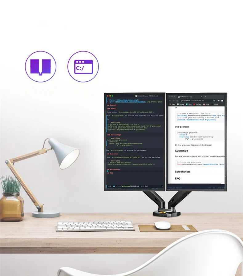 F160N desktop dual screens flexi-monitor mount is built-in durable Gas-strut cylinder to enable to move your screens any directions and height at your wish. Allow you to experiencing the best of ecological interface design for the best viewing position. F160N dual screens desktop lcd mount designed specially for people whom needs multi-screens and multi-tasks to enhance their productivitive in office works, finance, design and IT. Added that gravity spring pivot joint design offered effortless titling position to eliminate gray viewing angle.