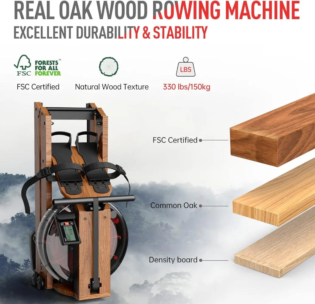 • 【Premium Solid Oak Build】 water rowing machines are made of FSC certified premium solid oak wood, which has excellent durability and stability to support 330lbs/150kg max load. User height up to 39"/195 cm.